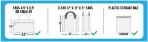 Clear bags no larger than 12” x 12” x 6”
